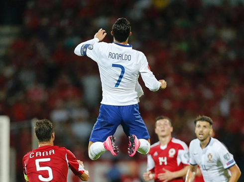 Cristiano Ronaldo jumping high in the air, in Albania vs Portugal