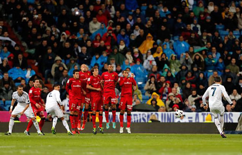 Cristiano Ronaldo taking a free-kick in Real Madrid 5-2 Mallorca, in a La Liga home fixture at the Santiago Bernabéu
