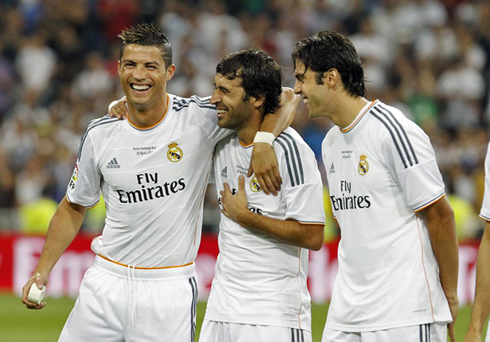 The Real Madrid team photo after having won the Santiago Bernabéu trophy in 2013, with Raúl, Ronaldo and Casillas in the center