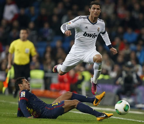 Cristiano Ronaldo sprinting and jumping over Thiago Alcântara, in Real Madrid 1-1 Barcelona, for the Copa del Rey 2012-2013
