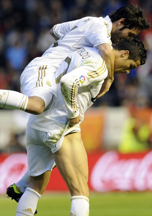 Cristiano Ronaldo with Granero on his back, pulling his shorts up to show his right leg muscles after scoring a goal in Osasuna vs Real Madrid in 2012