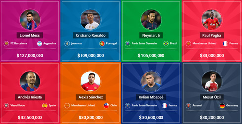 This infographic also shows us that there's a huge difference in earnings from the top 3 players (Messi, Ronaldo and Neymar) and the rest of the pack. Messi is on the very top with 127 million USD, followed by Cristiano Ronaldo with 109 million USD and Neymar Jr. with 105 million USD. They're all relatively close, but the same can't be said about the rest of the group. Paul Pogba stands in 4th place, but his total earnings are believed to be around 33 million USD, which is roughly 3 times less than Neymar and 4 times less than Messi.